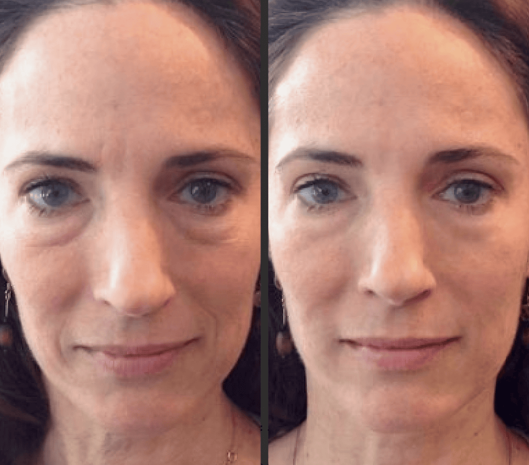 Mit der kleineren Seite des Gua Sha für 2–3 Minuten von den Augenlidern zu den Schläfen streichen. Ebenso unter den Augen bis zum Ohr führen.